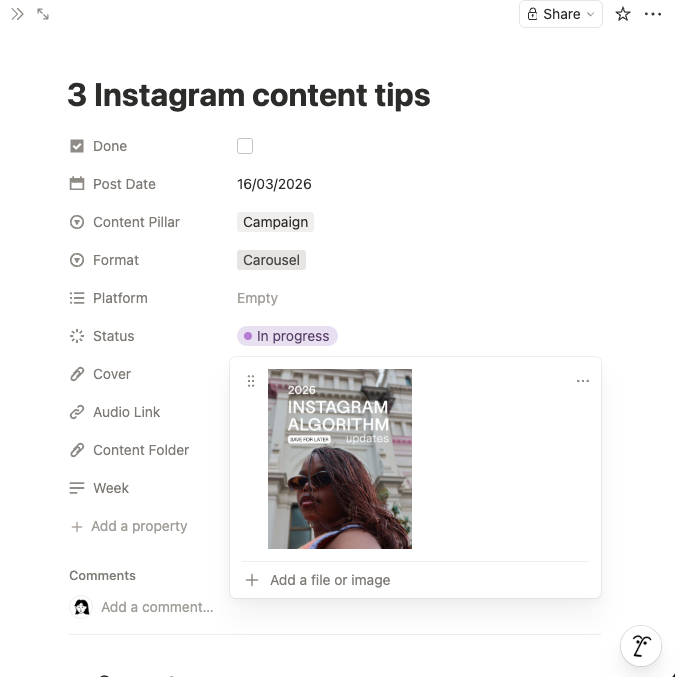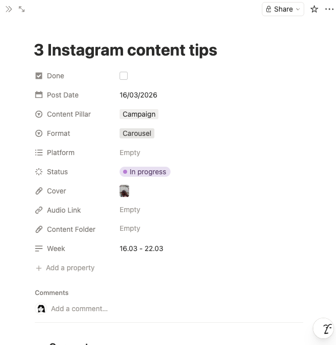 No app switching: Everything lives in Notion. No exporting, no third-party tools, no complicated integrations, just seamless Instagram planning where you work.